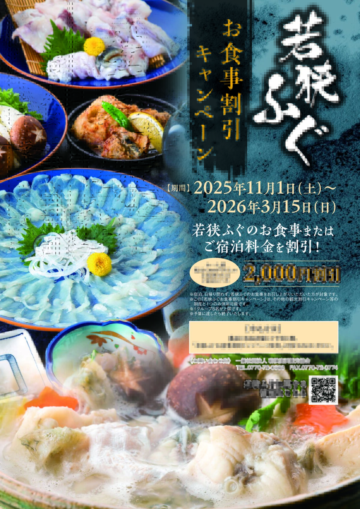 11月1日より若狭ふぐのお食事またはご宿泊料金を割引!
