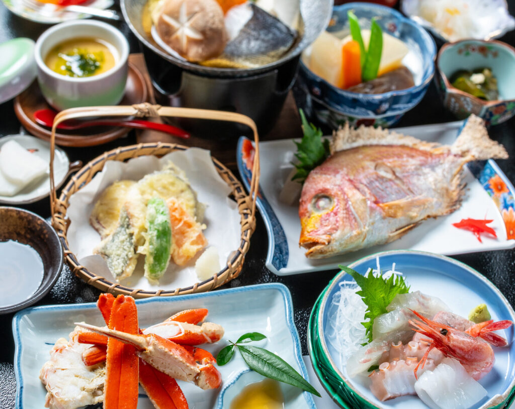 舟盛、焼がに、かに刺し、かにすき、天婦羅、雑炊、小鉢2品、デザート