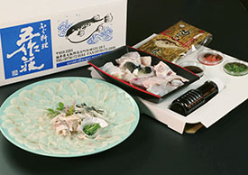 内容:てっさ、てっちり用アラ身、ひれ酒用ひれ、五作荘特製ポン酢、薬味、福のこ切身