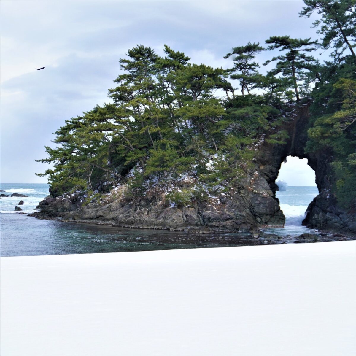 城山公園は、日本海の雄大な景色を一望できる自然豊かな公園です。冬の時期は特に、明鏡洞と荒波が打ち寄せるダイナミックな光景を間近で見ることができ、自然の力強さを感じられます。冬の日本海の荒々しさを体感するなら、城山公園は外せません。